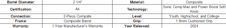 The third-generation Double Barrel 3 technology gives hitters exceptional feel and the hottest exit velocities possible, thanks to the low-compression outer barrel and a lightweight inner barrel to govern performance right at the maximum allowed limit. Plus, our Sonic Comp Max material is the most consistent, durable composite we’ve ever made, resulting in an enormous sweet spot and a sound that’s nothing less than iconic.