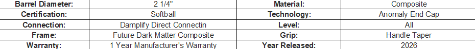 Power your lineup with the 2026 DeMarini Future (-10) Fastpitch Softball Bat, designed for elite hitters to deliver hard & loud contact. Future’s barrel is optimized to trampoline pitches for extra-base hits, leveraging a huge gap between inner and outer barrel walls from the connection to the end cap to create a massive sweet spot. Future’s softer Damplify Knob and handle taper is designed for comfortable hand positioning and improved feel through the swing. Equipped with DeMarini’s loudest barrel ever and a Damplify Direct Connection to soften vibration, Future empowers the best softball players to be the next big thing.