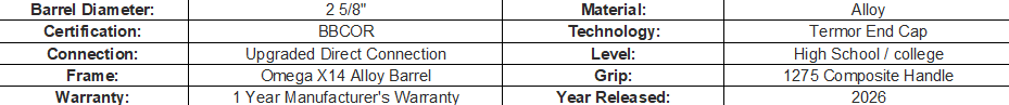 Making its debut as the lightest-swinging hybrid bat in our BBCOR family, the 2026 Omega (-3) BBCOR Baseball Bat empowers players to build a controlled, repeatable swing for improved exit velocities, optimal launch angles and maximum distance. The same materials found in The Goods take on a new shape in Omega’s X14 Alloy Barrel profile, prioritizing balance to help players get the bat head over the plate and consistently catch up to the high fastball. Omega, backed by DeMarini’s Expanded BBCOR Warranty, uses an Upgraded Direct Connection and 1275 Composite Handle to deliver a comfortable feel and forgiveness for reduced hand sting.