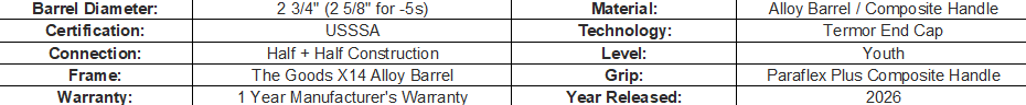 Make your presence felt from the first swing of your 2026 The Goods™ USSSA Baseball Bat. The two-piece hybrid features an easy swinging 2 3/4” (2 5/8" for -5s) X14 Alloy Barrel with an enormous-sweet spot, making it ideal for the youngest travel ball players to refine their swing and make solid contact. The barrel’s 2 3/4” (2 5/8" for -5s) diameter – the largest allowed in USSSA competition – helps rising stars square up more pitches. Half + Half Construction with a new Direct Connection pairs the barrel with a forgiving composite handle to minimize hand sting while boosting performance.