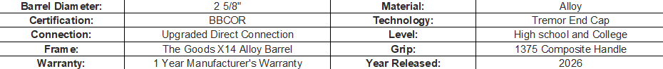 Aim for the outfield wall with 2026 DeMarini The Goods™ Gunmetal (-3), DeMarini’s heaviest-swinging BBCOR bat for home run hitters to hang crooked numbers on the scoreboard. This special edition look for The Goods maintains its signature X14 Alloy Barrel with a matte gunmetal and yellow paint job, empowering the heart of the order to smoke extra-base hits. High-powered high school and college players can launch huge hits with The Goods’ massive barrel profile, durable Upgraded Direct Connection and stiff 1375 Composite Handle. Backed by DeMarini’s Expanded BBCOR Warranty, The Goods™ Gunmetal drops the hammer on incoming pitches.