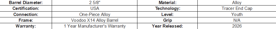 Take your swing to the next level with the 2026 Voodoo® One USA Baseball Bat, an ultra-light alloy design to help young players make frequent solid contact. This one-piece bat mirrors its BBCOR counterpart with a stiff design, easy to get through the zone and barrel up more pitches. Its durable X14 Alloy Barrel offers consistent results, and a lightweight Tracer End Cap optimizes performance while maintaining the balanced feel for total control of the at-bat.