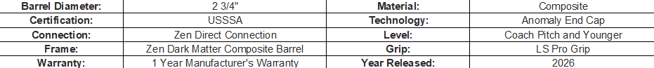 The youngest travel ball and JBB baseball players can square up more pitches and rack up hits with the 2026 Zen (-11) USSSA Baseball bat, formulated with a light-swinging Dark Matter Composite Barrel that offers a huge swing spot. The gradual barrel taper delivers peak performance along the length of the barrel, helping young players create solid contact right away as they find their swing. Zen’s two-piece construction uses a Direct Connection to pair the barrel with a comfortable composite handle, boosting bat speeds while minimizing hand sting so young hitters can find their Zen at the plate.