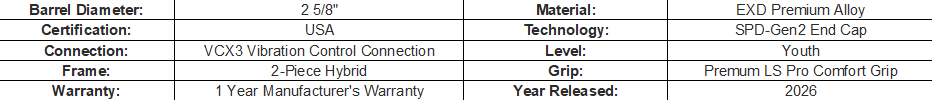 Pairing an alloy barrel with a composite handle, the 2026 Select PWR™ USA Baseball Bat gives young players the power and comfort needed to crush any pitch they see. Thanks to a 2-piece design, patented VCX3 Vibration Control Connection and Pro Design Knob Taper, the Select PWR™ offers unbelievable feel and a balanced swing–letting hitters unleash the easy power of the EXD Premium Alloy barrel.