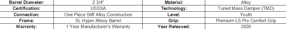 Travel ball’s biggest power threats become even more dangerous with the 2026 Atlas™ USSSA Baseball Bat. Engineered end-to-end for swing speed and power, one-piece SL Hyper Alloy Construction combines with the XPND Performance End Cap for an enormous sweet spot while new Tuned Mass Damper technology and Pro Design Knob Taper give the Atlas incredible feel – perfect for players on the cusp of BBCOR play.
