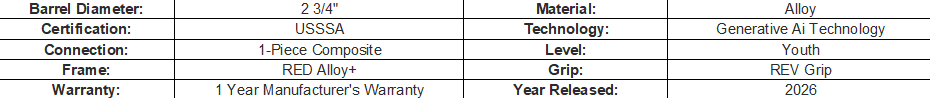 This one-piece alloy bat features a balanced, mid-weight swing designed to give you fast hands and a huge sweet spot — perfect for travel ball players who want to do damage. The RevGrip™ premium grip adds elite comfort and control, while the tuned stiffness of the handle ensures immediate, powerful feedback with every swing.