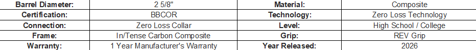 Built with In/Tense Carbon Composite material, this seamless barrel delivers explosive energy transfer, massive trampoline effect, and precision-balanced stiffness across its sweet spot. The tuned swing weight provides slight end-load for added power without sacrificing bat speed, ideal for elite hitters at the high school and college level.