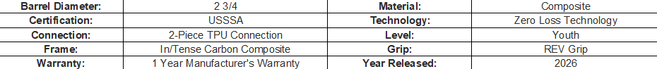 Built with In/Tense Carbon Composite material, this seamless barrel delivers explosive energy transfer, massive trampoline effect, and precision-balanced stiffness across its sweet spot. The tuned swing weight offers just enough end-load for extra power without slowing down your hands, while the Zero Loss Technology connection stiffens the handle for a powerful, responsive feel. Additionally, its Rev Grip ensures premium comfort and control on every swing.