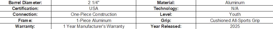 Crafted with a traditional one-piece alloy construction, this bat exudes classic style and feel. its high-strength, high-performing aerospace-grade alloy material ensures exceptional durability, withstanding the rigors of intense gameplay. The 2 1/4" barrel delivers an impressive and massive sweet spot, granting young players improved plate coverage and the confidence to make consistent, powerful contact. Equipped with an ultra-light speed cap, this bat enhances swing speeds through the hitting zone, maximizing their potential with every swing. Certified for USA Baseball leagues.
